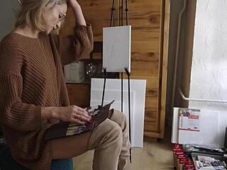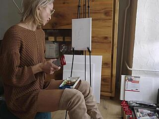 blonde babe in boots glasses paints her pretty pussy flower softcore