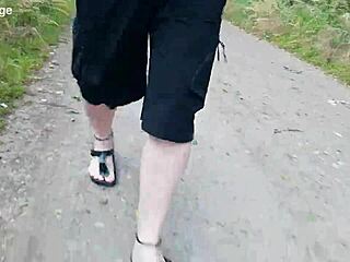 Chubby German hiker struts fat feet in Birkenstocks through wild outdoor trails barefoot style