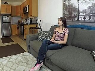 Young brunette, just 18, expertly sucks and rides a small cock.
