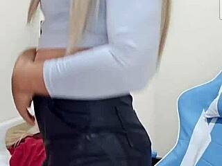 Busty blonde tranny enjoys slow solo masturbation at home