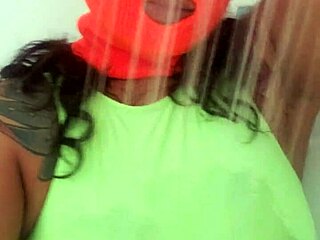 Amateur MILF in mask sucks and fucks with big tits exposed in hardcore session.