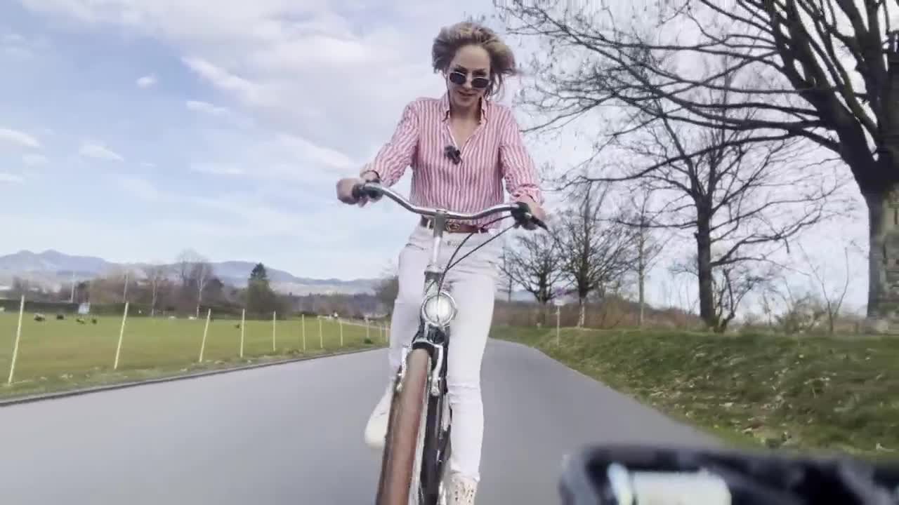 Šolarka v uniformi divje vozi kolo. Njene bele hlačke se svetijo pod mini krilom ob vsakem gibu.