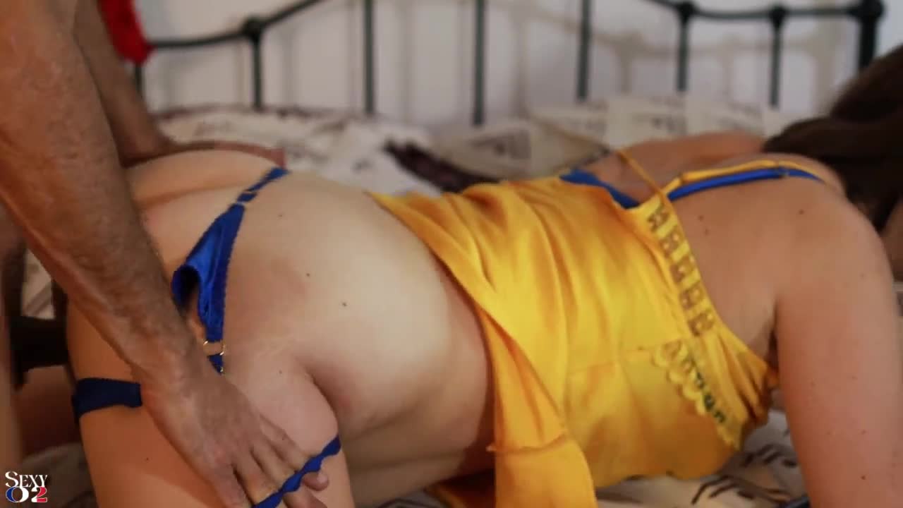 Amateur française en nuisette satin jaune frotte culotte puis doggy gorge profonde léchage cul